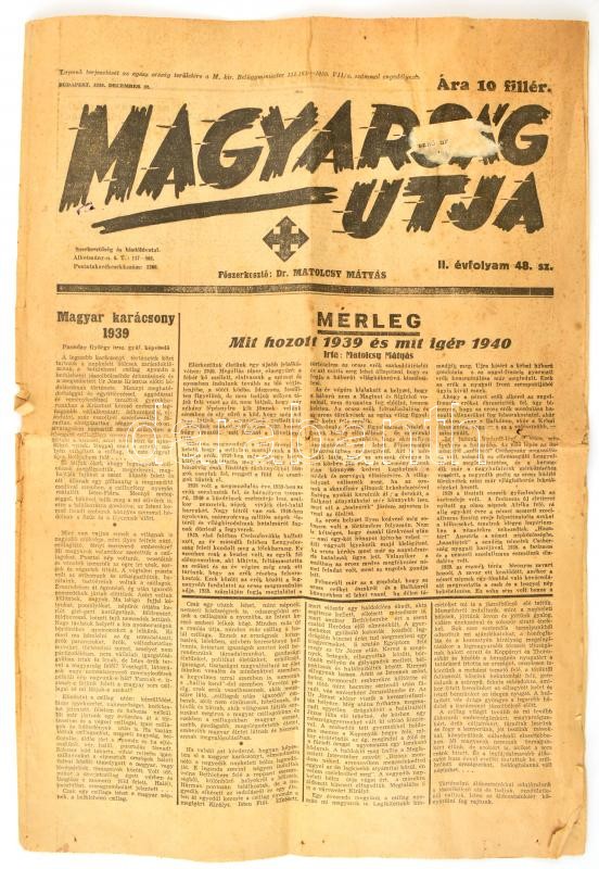 1939 Magyarság útja. Nyilas újság, II. évf. 48. sz. 1939. dec. 22. száma. Szerk.: Dr. Matolcsy Mátyás, szakadozott, kissé foltos, 12 p.