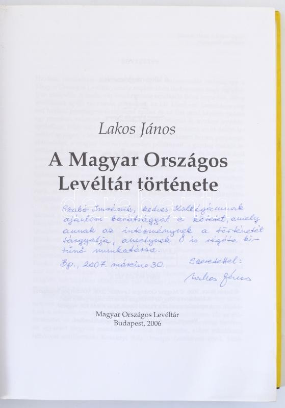 Lakos János: A Magyar Országos Levéltár története. Bp.,2006., MOL. Kiadói egészvászon-kötés, kiadói papÃr védÅ‘borÃtóban, foltos lapélekkel. A szerzÅ‘, Lakos (1947-2017), Magyar Országos Levéltár egykori fÅ‘igazgatója (1992-1997) által dedikált.