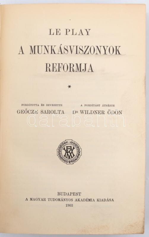 Le Play: A munkásviszonyok reformja. Ford. és bevezette: Geőcze Sarolt... https://www.darabanth.com/en/363-Online-auction/363.0/Books/Books-History~1000004/Le-Play-A-munkasviszonyok-reformja-Ford-es-bevezette-Geocze-Sarolta-Bp-1903-MTA-VIIIplus540-~II2094227