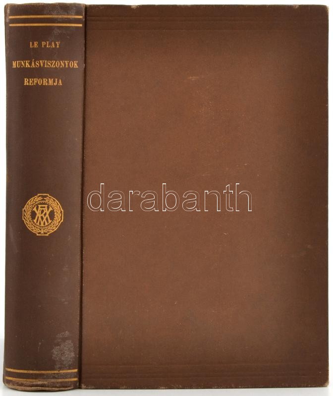 Description: Le Play: A munkásviszonyok reformja. Ford. és bevezette: Geőcze Sarolta. Bp.,1903., MTA,VIII+540 p. Kiadói aranyozott egészvászon-kötés, márványozott lapélekkel, kissé kopott borítóval.
