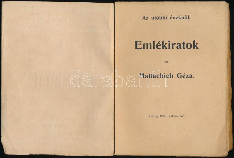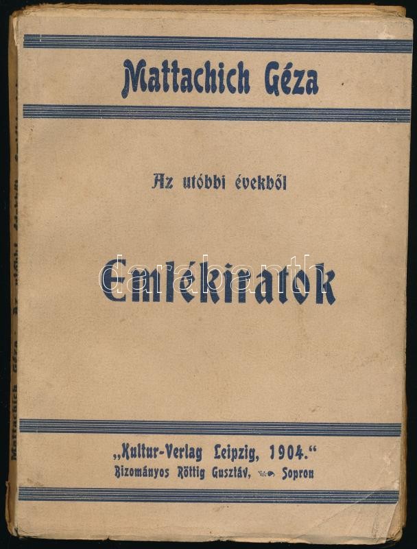 Mattachich Géza (Mattachich-Keglevich Géza (1858-1923): Az utóbbi évekbÅ‘l, emlékiratok. Bp.,1904., "Kulturverlag",(Röttig Gusztáv-ny., Sopron.), 8+211 p. Kiadói papÃrkötés, kijáró lapokkal, kissé foltos borÃtóval, megviselt állapotban. Ritka!