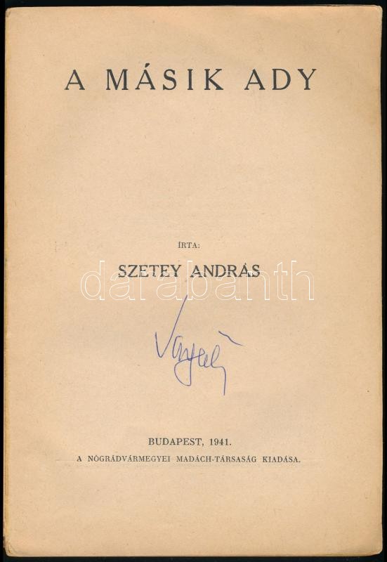 https://www.darabanth.com/en/363-Online-auction/363.0/Books/Books-Other-rarities~1000018/Szetey-Andras-A-masik-Ady-Bp-1941-Nogradvarmegyei-Madach-Tarsasag-104-p-Kiadoi-papir~II2097392