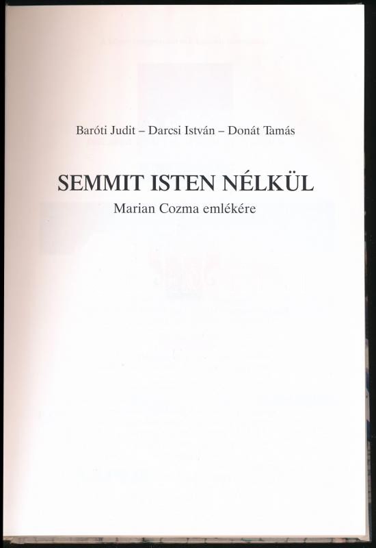 Description: Baróti Judit-Darcsi István-Donáth Tamás: Semmit isten nélkül. Marian Cozma emlékére. Veszprém, 2009., Veszprém Megyei Jogú Város Önkormányzata. Kiadói kartonált papírkötés.