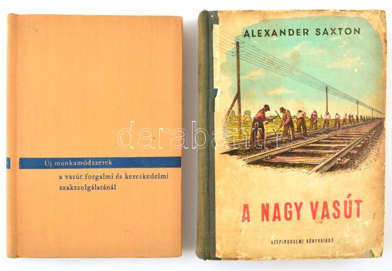 Új munkamódszerek a vasút forgalmi és kereskedelmi szakszolgálatánál. 1945-1965. Bp.,1965., Közlekedési Dokumentációs Vállalat. Kiadói egészvászon-kötés. +Alexander Saxton: A nagy vasút. Ford.: Gábor György. Bp.,1950.,Szépirodalmi. Kiadói kopott félvászon-kötés.