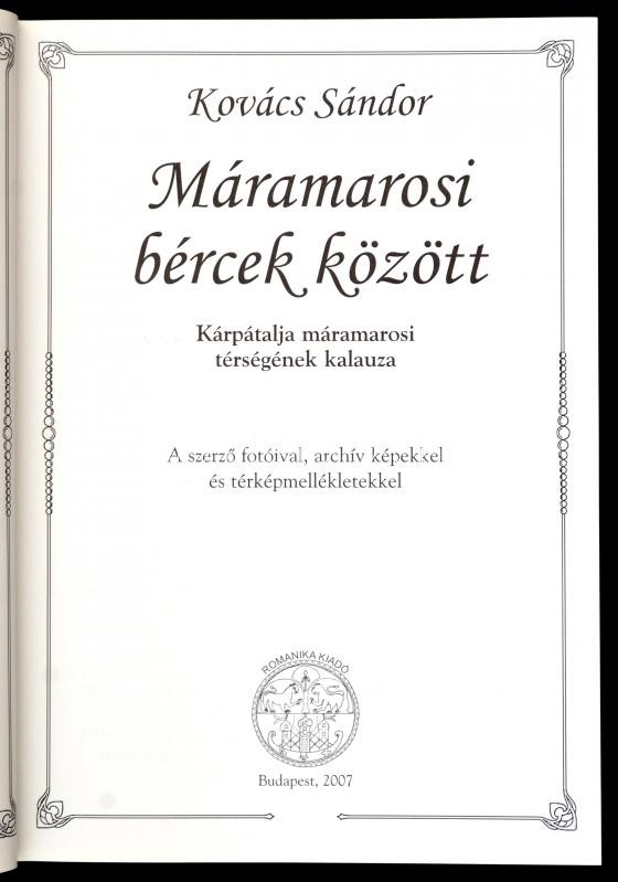 Kovács Sándor: Máramarosi bércek között. Kárpátalja máramarosi térségének kalauza. Bp., 2007, Romanika. Szövegközti szÃnes képekkel, és egészoldalas térképekkel illusztrált. Kiadói kartonált papÃrkötés. A szerzÅ‘ által dedikált.