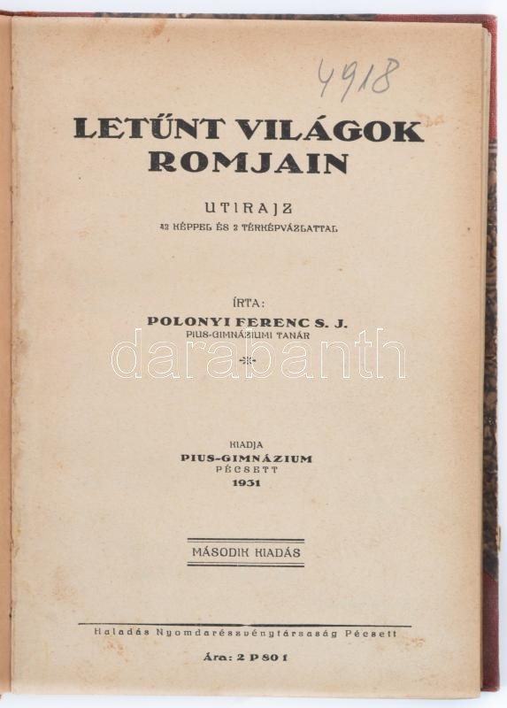 Polonyi Ferenc: Letünt világok romjain. Utirajz 42 képpel és 2 térképvázlattal. Pécs, 1931. Haladás Ny. 162 l. Gazdagon illusztrálva. Korablei félvászon kötésben
