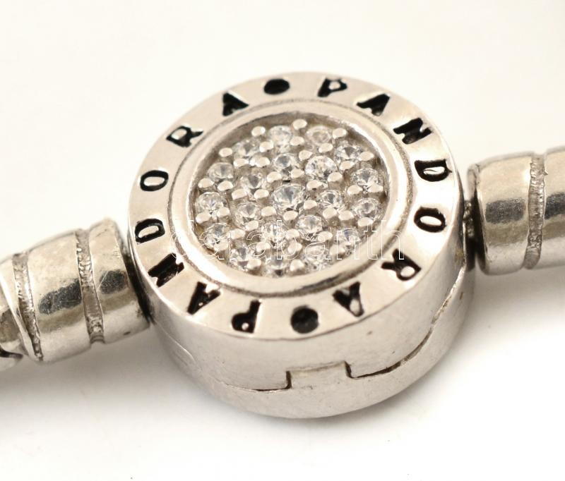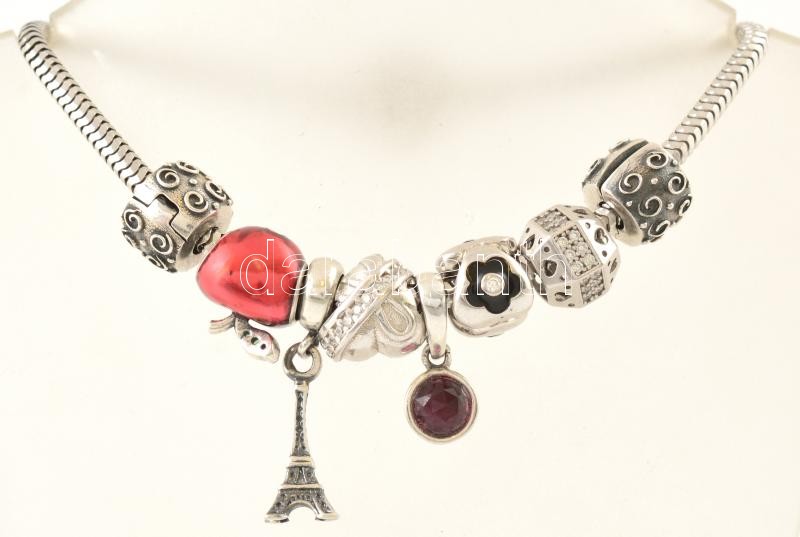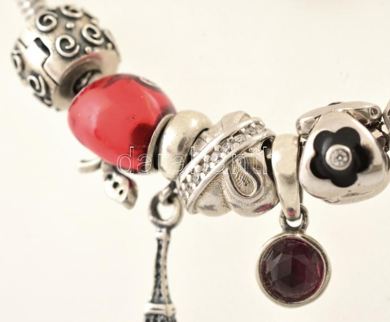 Ezüst(Ag) karkötő, charmokkal, Pandora jelzéssel, h: 18,5 cm, bruttó: ...