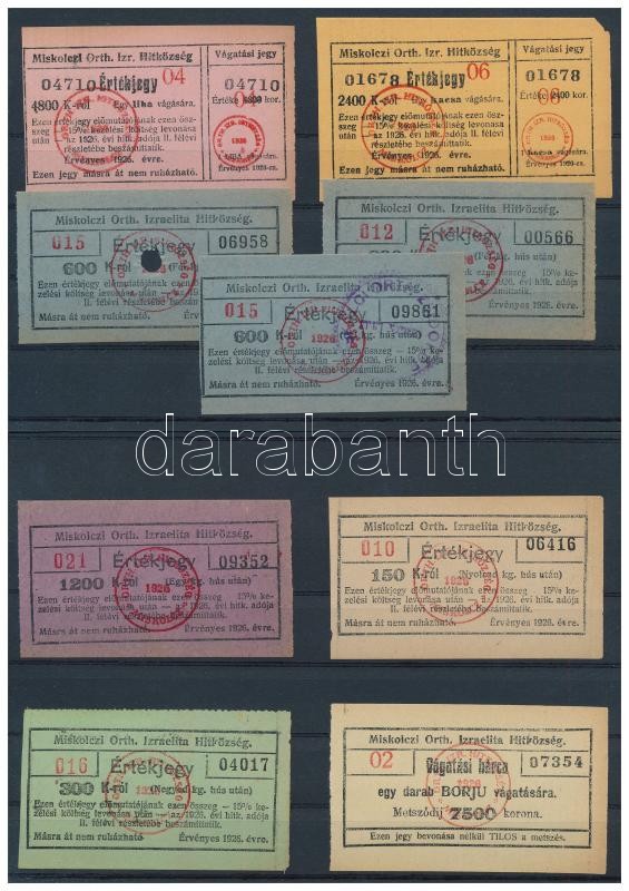 Miskolc 1925-1936. "Miskolczi Orthodox Izraelita Hitközség" 46db vágatási bárca és értékjegy, közte érvénytelenített darabok is T:I-,II