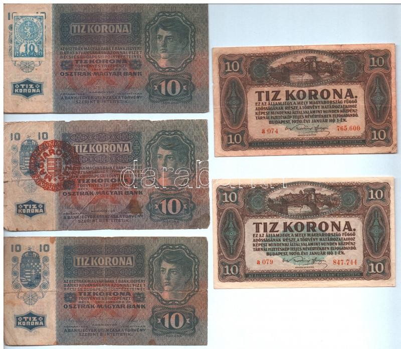 Description: 1915. 10K (3xklf) egy csehszlovák bélyeggel, egy "MAGYARORSZÁG" körbélyegzővel, egy pedig "Deutschösterreich" felülbélyegzéssel + 1920. 10K (2x) T:III,III- szakadt