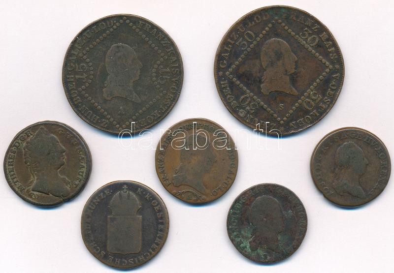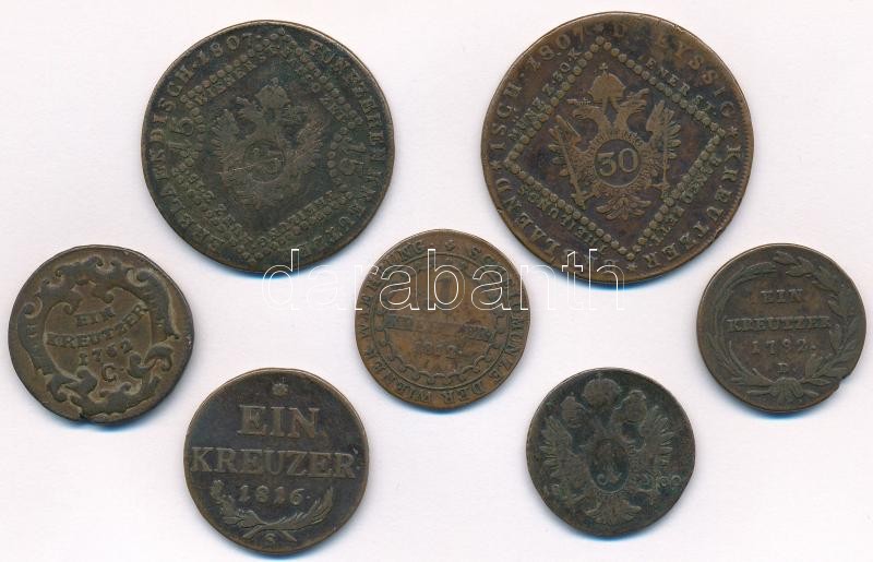 1762-1816. 7db klf magyar és osztrák verdejelű rézkrajcár, közte 1782B 1kr Cu "II. József", 1807S 30kr Cu "I. Ferenc" T:2-,3