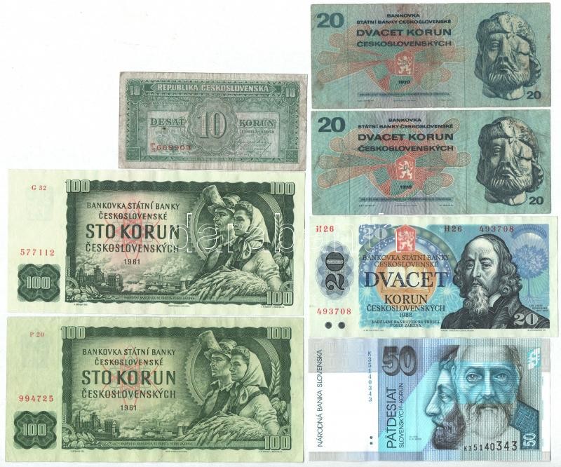 Czechoslovakia 1945. 10 Korun + 1961. 100 Korun (2x) + 1970. 20 Korun (2x) + 1988. 20 Korun + 2002. 50 Korun C:AU-VG