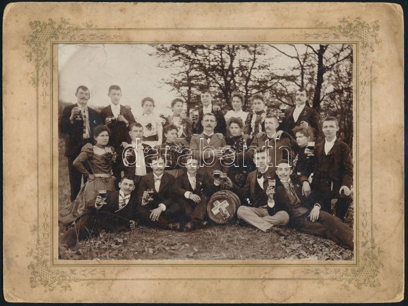 cca 1900 Söröző társaság, Dreher Ászok Seres hordóval, kartonra kasíro...