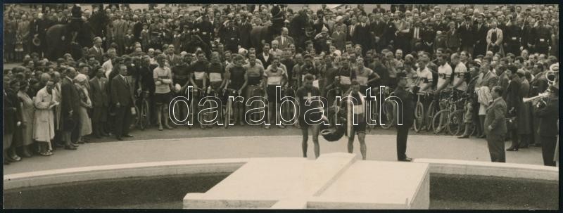 cca 1925 Kerékpárversenyzők koszorúznak a millenniumi emlékműnél, 8,5x23 cm