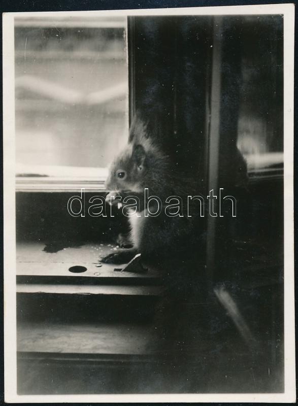 Description: cca 1933 Kinszki Imre (1901-1945) budapesti fotóművész jelzés nélküli vintage fotója, az általa összeállított gyűjtőalbumból kiemelve (Mókus az ablakban), 8,7x6,4 cm