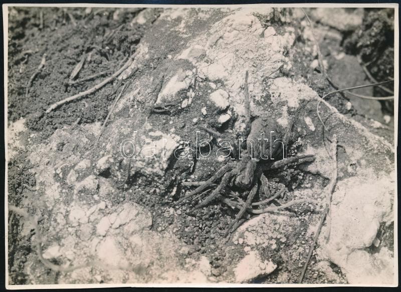 Description: cca 1935 Kinszki Imre (1901-1945) budapesti fotóművész pecséttel jelzett, feliratozott, vintage fotóművészeti alkotása (Farkaspók az Ujlaki-hegyen), 12,5x17,4 cm