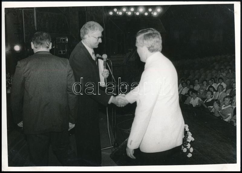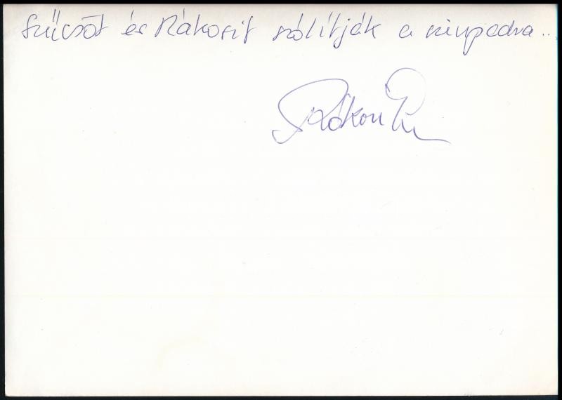 cca 1984 Az FTC egykori focistái Rákosi Gyula és Szűcs Lajos ünnepségen, Rákosi Gyula eredeti aláírásával a hátoldalon, 13×18 cm