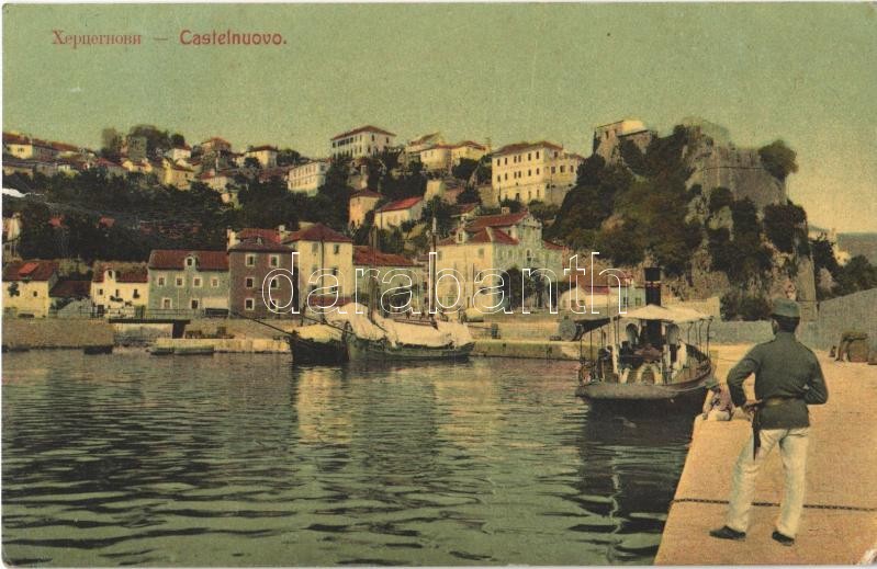 1913 Herceg Novi, Castelnuovo; port, sailing vessels, steamship (tear)