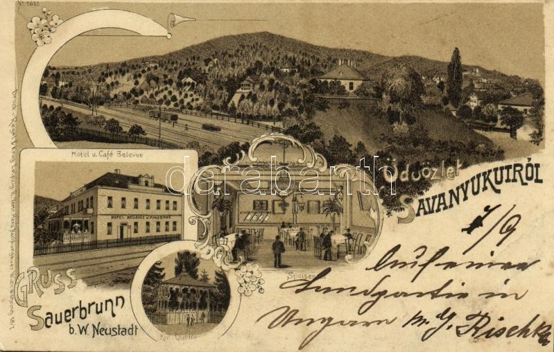 Savanyúkút, Sauerbrunn; J. Pinesithz Belevue szálloda és kávéház, étkező belső, kút / Hotel und Café, Speisesaal, Quelle / hotel and cafe interior, dining hall, well. Art Nouveau, floral, litho