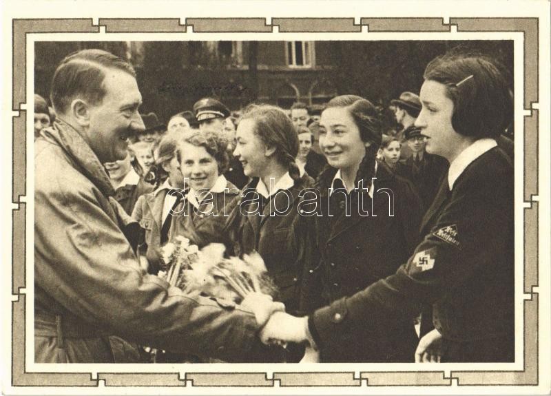 Adolf Hitler with Hitlerjugend. NSDAP German Nazi Party propaganda 6+19 Ga. + So. Stpl