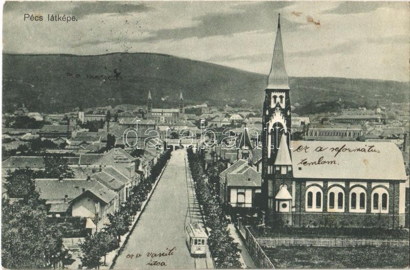 1914 Pécs, látkép, Református templom, villamos. Karpf Berta kiadása (EB)