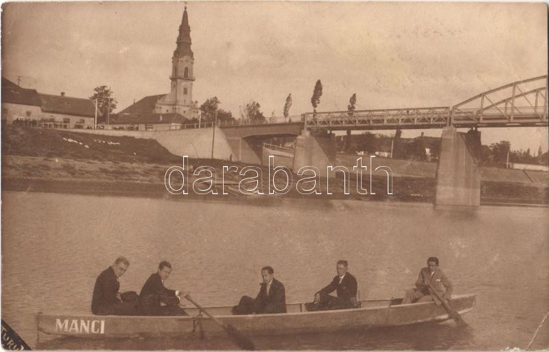 1927 Kunszentmárton, Hármas-Körös hídja, Római katolikus templom, elegáns férfiak "Manci" evezős csónakban. photo (EK)