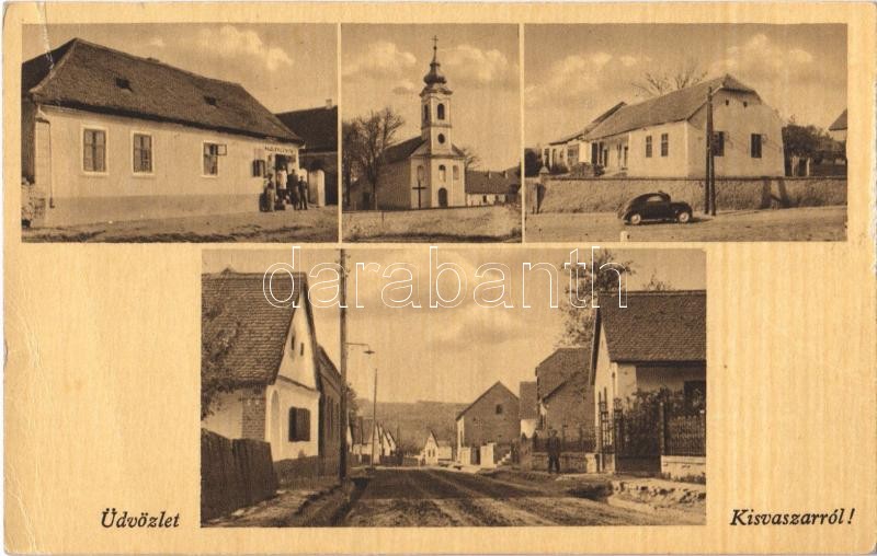 1948 Kisvaszar, Utcakép, római katolikus templom, automobil, Hangya Sz...