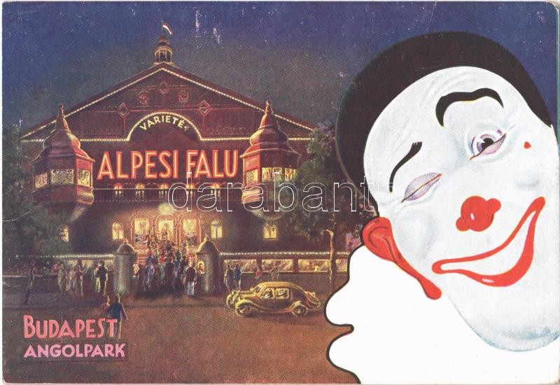 Budapest XIV. Alpesi Falu Barieté az Angol parkban. Reklámlap bohóccal...