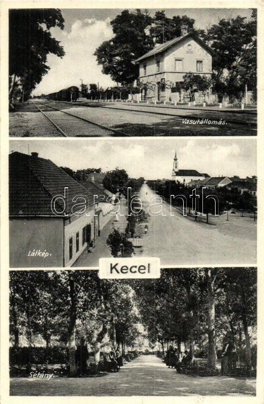Kecel, Vasútállomás, gőzmozdony, látkép, sétány. Szabolcs Testvérek kiadása + KALOCSA-KISKÖRÖS 135. vasúti mozgóposta