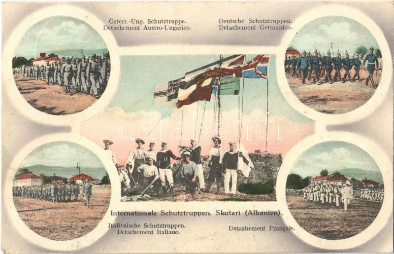 1914 Shkoder, Shkodra, Skutari; Internationale Schutztruppen, Österr.-Ung., Deutsche, Italienische, Französische Schutztruppe / International Defense Troops in Shkodra (Albania): Austro-Hungarian K.u.K., German, Italian, French troops, flags, soldiers, mariners
