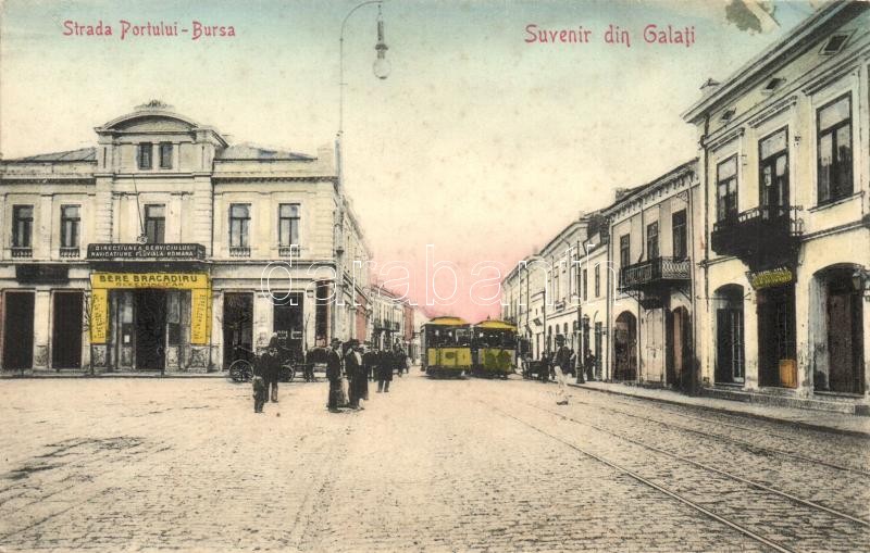 Description: Galati, Strada Portului Bursa, Directiunea Serviciului Navigatiune Fluviala Romana, Bere Bragadiru / street view with trams, Direction of the Romanian River Navigation Service, Bere sleeping cars