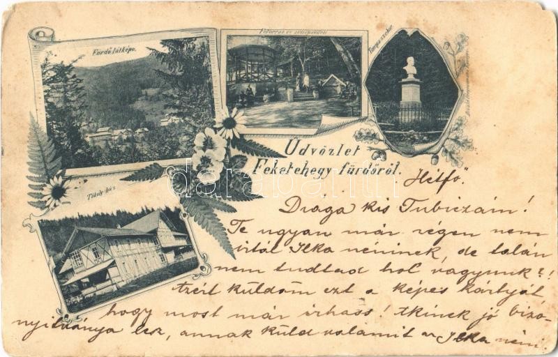 1898 Feketehegyfürdő, Feketehegy, Cernohorské kúpele (Merény, Vondrisel, Nálepkovo); főforrás, zenepavilon, Tompa szobor, Tököly ház / spring, music pavilion, statue, villa. Art Nouveau, floral (EM)