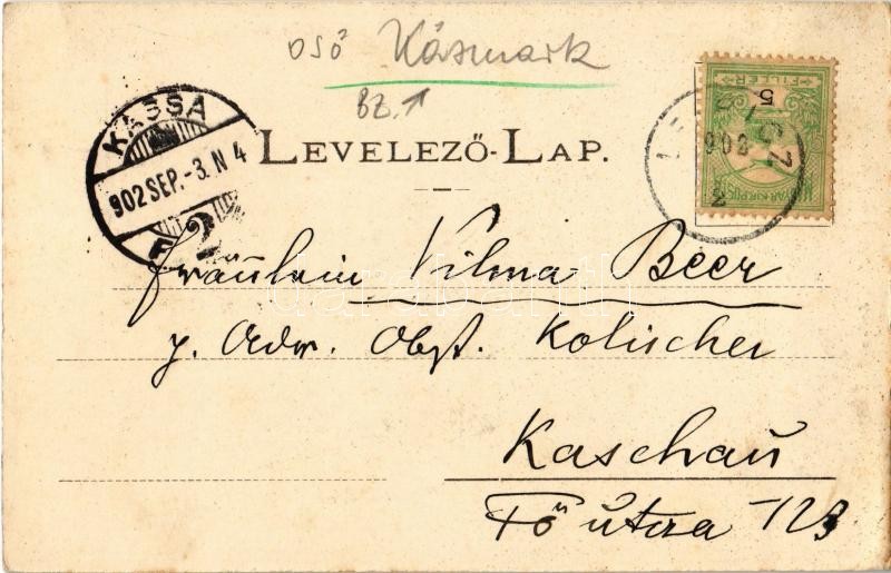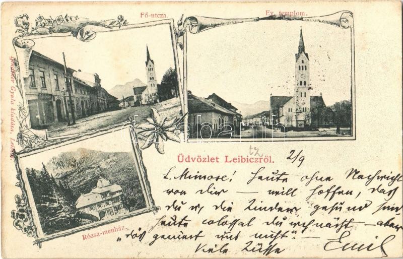 Description: 1902 Leibic, Leibicz, Leibitz, Lubica; Evangélikus templom, Fő utca, Rózsa menház. Lindtner Gyula kiadása / church, main street, rest house. Art Nouveau, floral