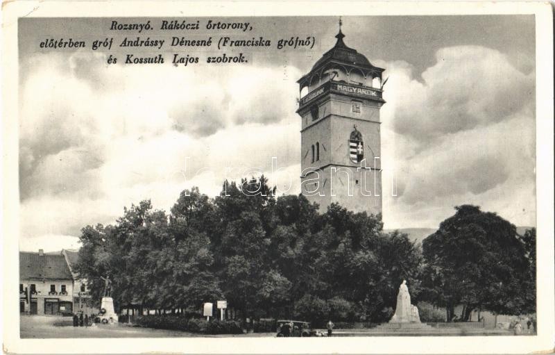 Description: 1940 Rozsnyó, Roznava; Rákóczi őrtorony irredenta felirattal és magyar címerrel, előtérben Gróf Andrássy Dénesné (Franciska grófnő) és Kossuth Lajos szobrok, automobil / Rákóczi watchtower with Hungarian coat of arms and irredenta propaganda, statues, automobile (EK)