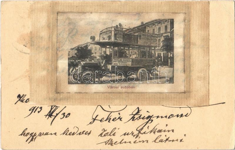 Description: 1913 Arad, Városi autóbusz, rajta Berczy Pál, Weinberger János, Schaffer Henrik, Winberger Ferenc, Pichler Sándor, Fleischer Testvérek üzletének reklámja / autobus with shop advertisements (EB)