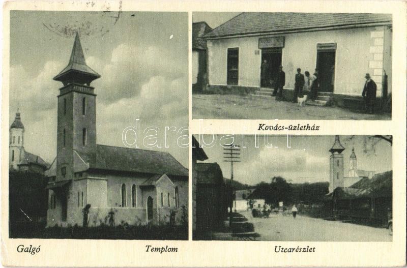 1944 Galgó, Galgau; Templom, Kovács-üzletház, utcarészlet / church, shop, street view (EK)