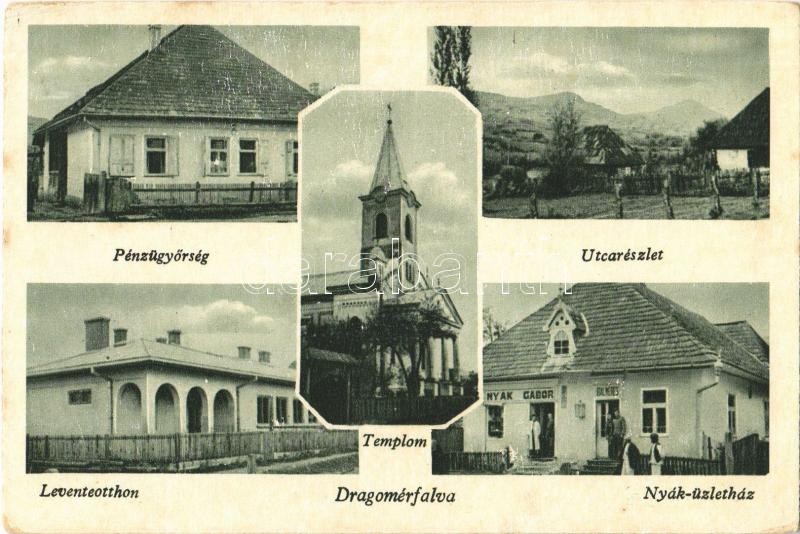 1949 Dragomérfalva, Dragomir, Dragomiresti; Pénzügyőrség, utcarészlet, templom, Leventeotthon, Nyák-üzletház / finance guard, street view, church, barracks, shop (kopott sarkak / worn corners)