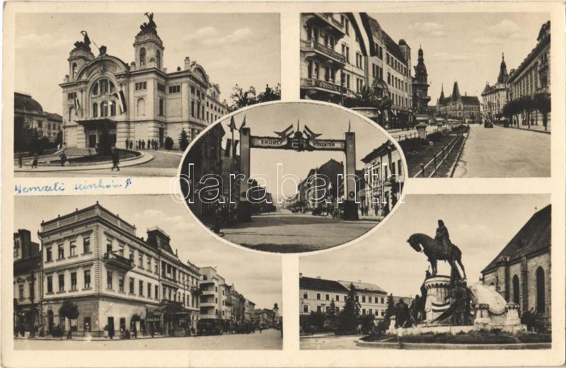 Description: Kolozsvár, Cluj; Nemzeti színház, Minerva Biztosító, Erdély visszatér bevonuláskori irredenta díszkapu / theatre, insurance company, Irredenta decorated gate from the entry of the Hungarian troops