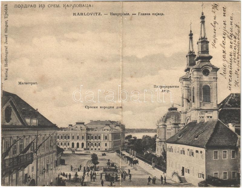 Description: Karlóca, Karlowitz, Sremski Karlovci; Hauptplatz / Fő tér, Szerb Nemzeti Ház, bírósági hivatal. Kihajtható panorámalap / main square, Serbian National House, courts. folding panoramacard (fl)