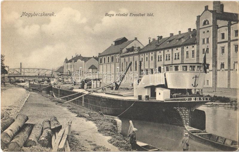 Nagybecskerek, Zrenjanin, Veliki Beckerek; Bega részlet, Erzsébet híd, "Ernő" uszály. Almásy és Szepessy kiadása / riverside, port, barge, bridge