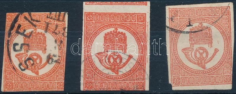 1871 3 db kőnyomású Hírlapbélyeg, különböző színárnyalatok, lemezhibák