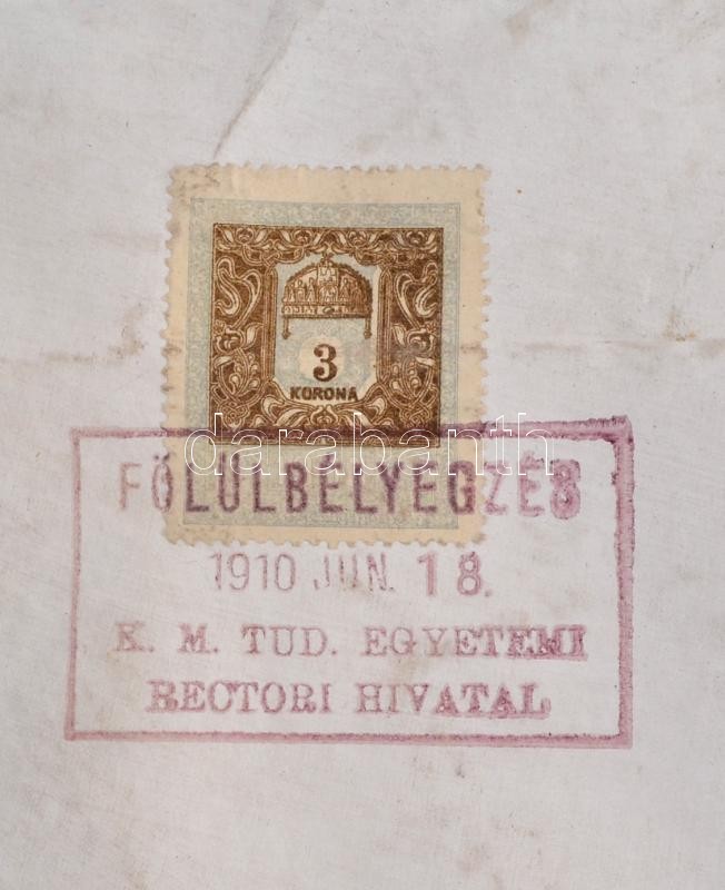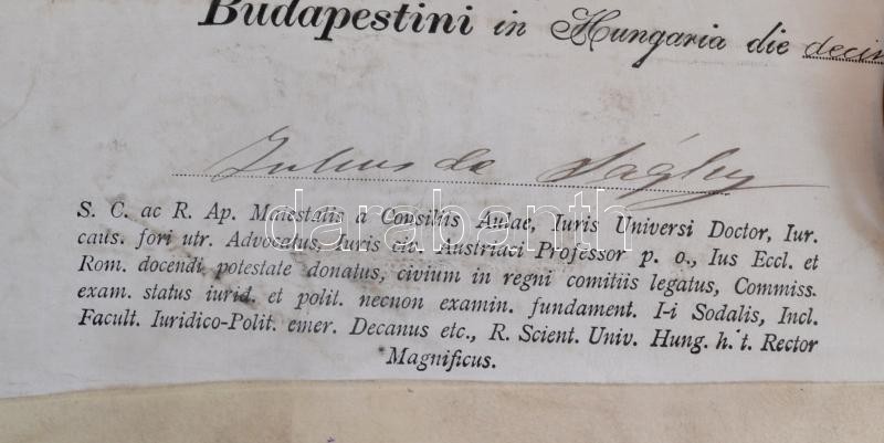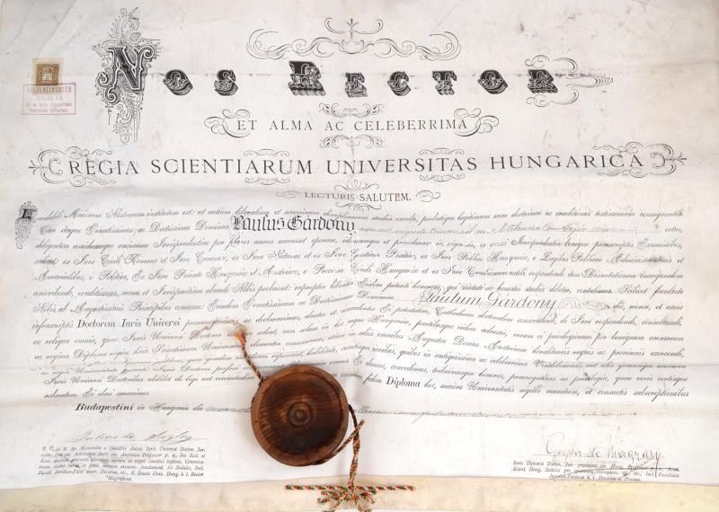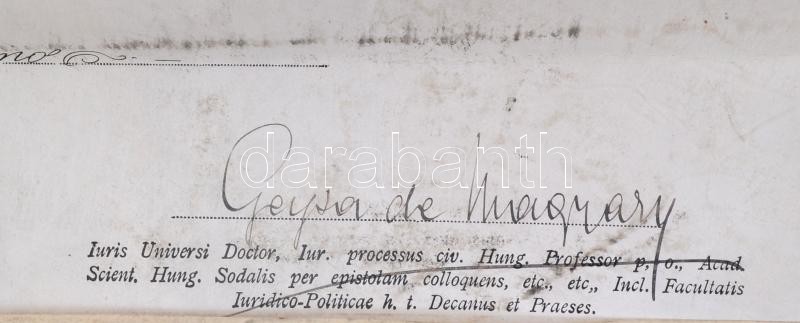 1910 Bp., Dr. Gárdony Pál zsidó származású személy (késÅ‘bb a pusztaberényi ménes tulajdonosa) jogi doktori diplomája, Sághy Gyula (1844-1916) rektor, Magyary Géza (1864-1928) dékán aláÃrásaival, pergamen, 3 K okmánybélyeggel, hiányos fatokos függÅ‘pecséttel, a hátoldala foltos.