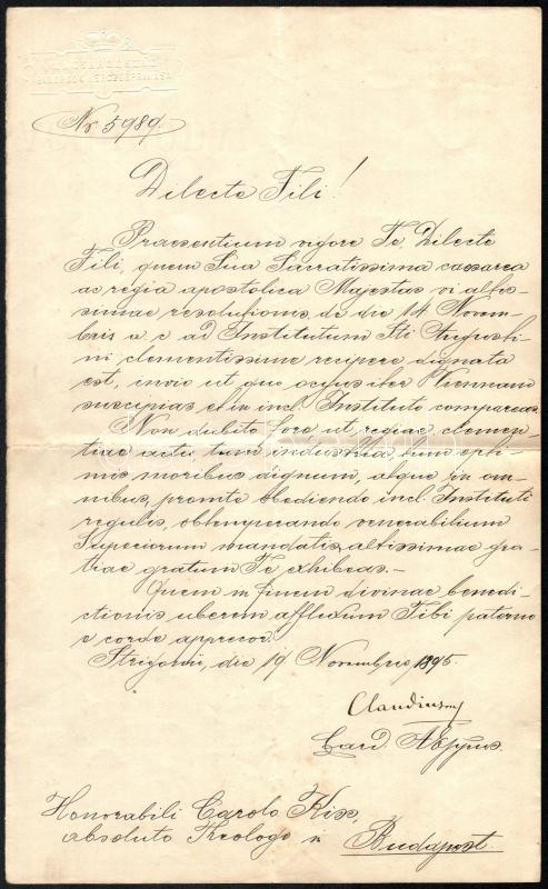 1895 Vaszary Kolos (1832-1915) bíboros által saját kézzel aláírt, kézz... https://www.darabanth.com/en/364-Online-auction/364.0/Art-and-other-collectibles/Historical-documents-manuscripts~500018/1895-Vaszary-Kolos-1832-1915-biboros-altal-sajat-kezzel-alairt-kezzel-irt-latin-nyelvu-k~II2106396