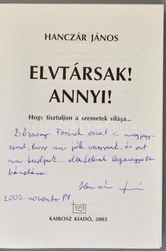 Hanczár János: Elvtársak! Annyi! Hogy tisztuljon a szemetek világa... ... https://www.darabanth.com/en/364-Online-auction/364.0/Books/Books-Other-rarities~1500020/Hanczar-Janos-Elvtarsak-Annyi-Hogy-tisztuljon-a-szemetek-vilaga-Bp-2003-Kairosz-Kiadoi-~II2105611
