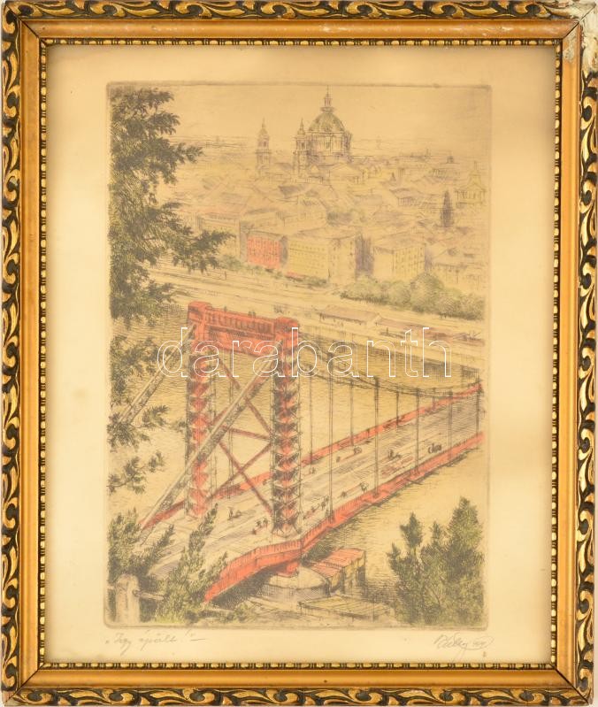 Olvashatatlan jelzéssel: Így épült (Erzsébet-híd), színes rézkarc, papír, üvegezett keretben, 29x20,5 cm