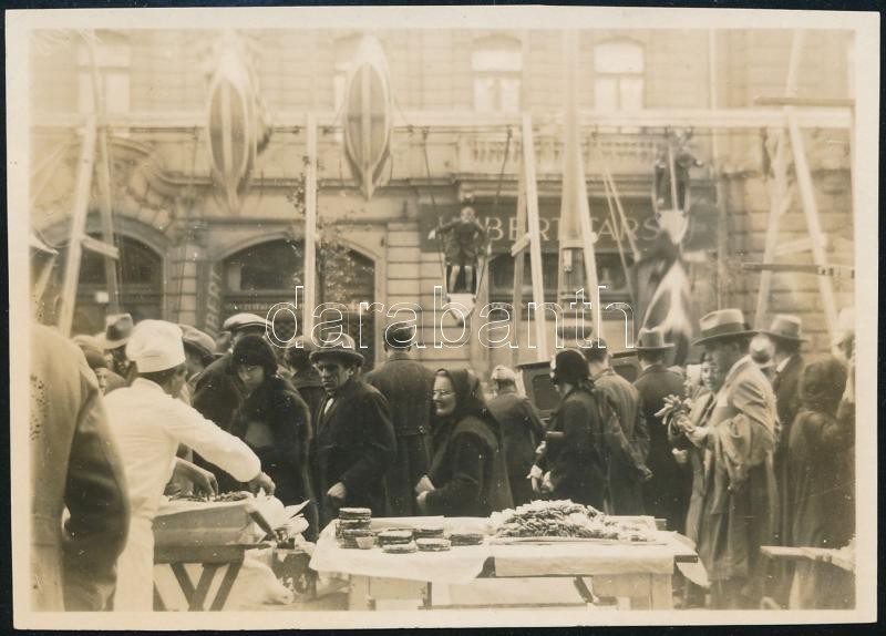 Description: 1931. november 9. Kinszki Imre (1901-1945) budapesti fotóművész hagyatékából jelzés nélküli, de a szerző által datált, vintage fotó (Kirakodóvásárban), 6x8,6 cm