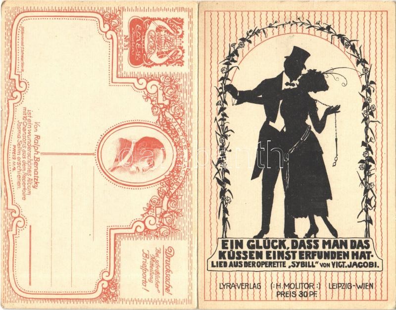 Description: Ein Glück, dass Man das Küssen einst erfunden hat. Lyra-Verlag H. Molitor von Ralph Benatzky / Couple, Art Nouveau silhouette folding postcard with music sheet