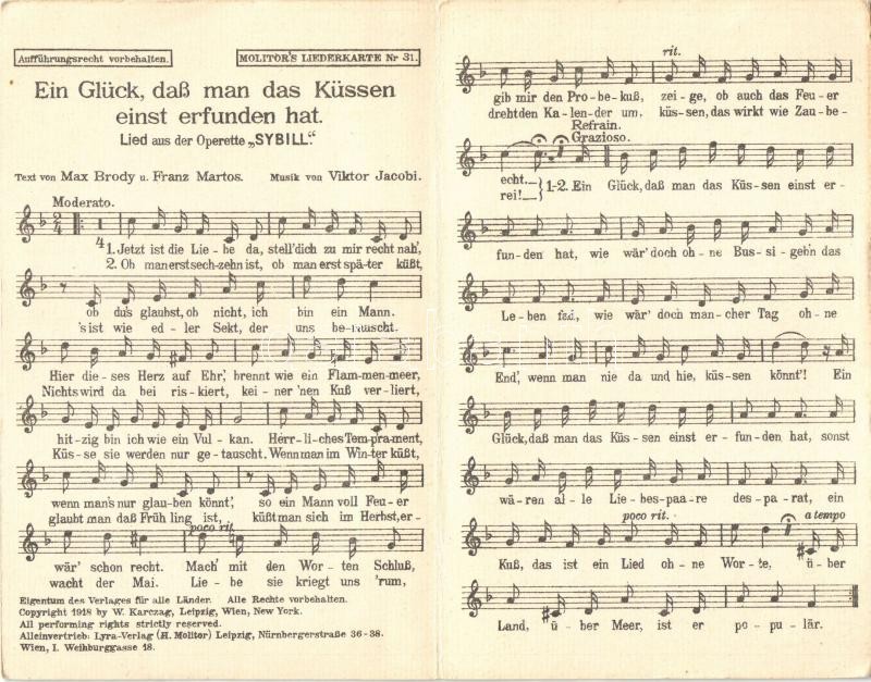 Ein Glück, dass Man das Küssen einst erfunden hat. Lyra-Verlag H. Moli... https://www.darabanth.com/en/364-Online-auction/364.0/Postcards/Art-postcards~1000073/Ein-Gluck-dass-Man-das-Kussen-einst-erfunden-hat-Lyra-Verlag-H-Molitor-von-Ralph-Benatzky-Cou~II2105522