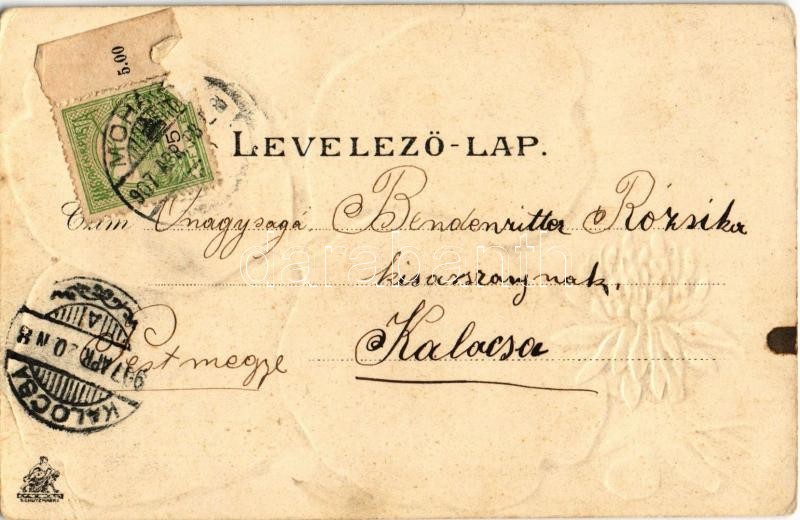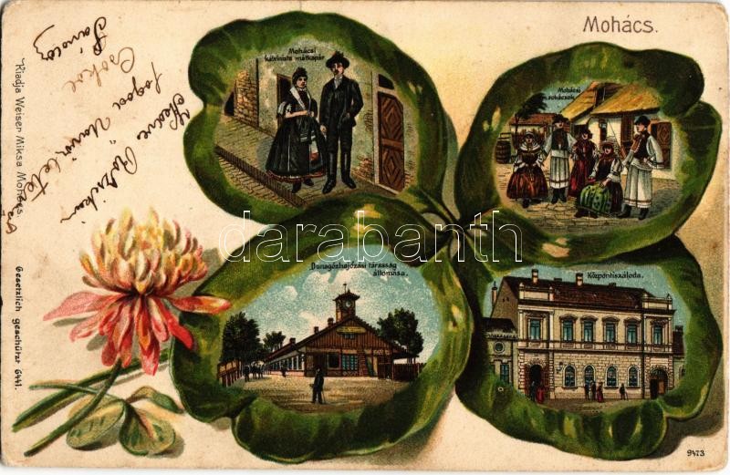 1907 Mohács, Kálvinista mátkapár, sokácok, Központi szálloda, Dunagőzhajózási társaság állomása. Weiser MIksa kiadása. Lóherés litho montázs / clover litho montage