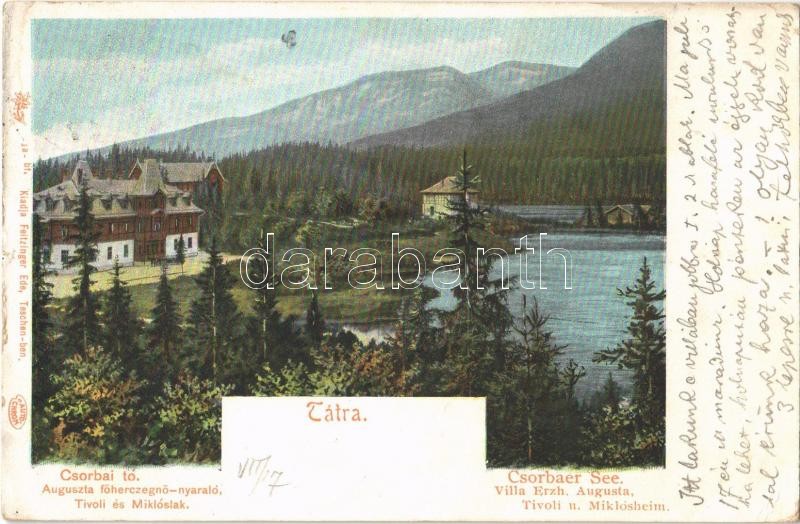 Description: 1901 Tátra, Magas Tátra, Vysoké Tatry - 2 db régi képeslap: Csorba-tó, Halastavak az őrházzal, Auguszta főhercegnő nyaraló, Tivoli és Miklós lak. Feitzinger Ede kiadása / 2 pre-1945 postcards from the High Tatras (Strbské pleso lake, villa, guardhouse)