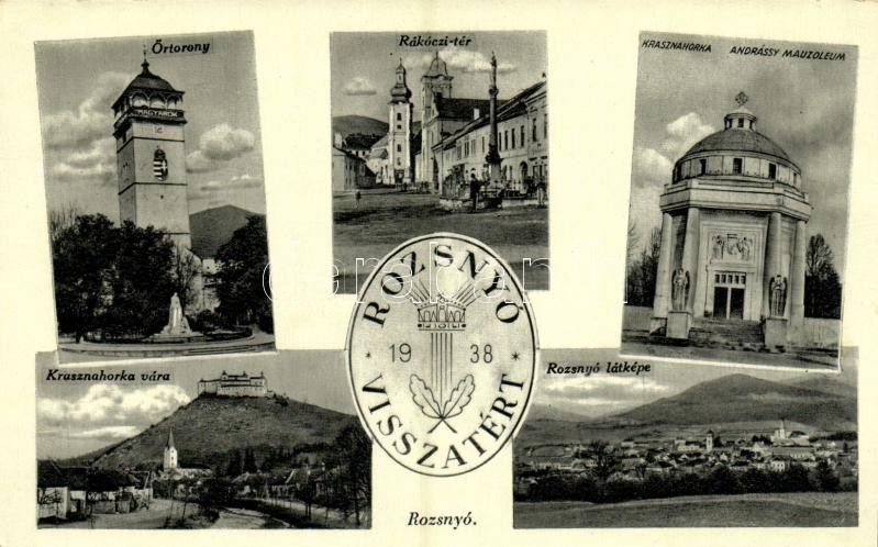 1938 Rozsnyó, Roznava; Rozsnyó visszatért, Rákóczi őrtorony magyar címerrel és irredenta felirattal, Rákóczi tér, Krasznahorka vára, Andrássy Mauzóleum / entry of the Hungarian troops, watchtower with Hungarian coat of arms and irredenta propaganda, square, Hrad Krásna Horka castle, mausoleum